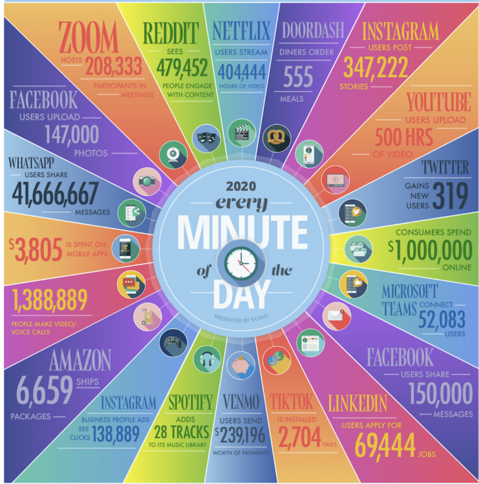 De Zoom à WhatsApp, en passant par Netflix et les réseaux sociaux tels que Facebook, Instagram et TikTok, retrouvez les 10 chiffres-clés sur les données échangées toutes les 60 secondes sur Internet en 2020 :